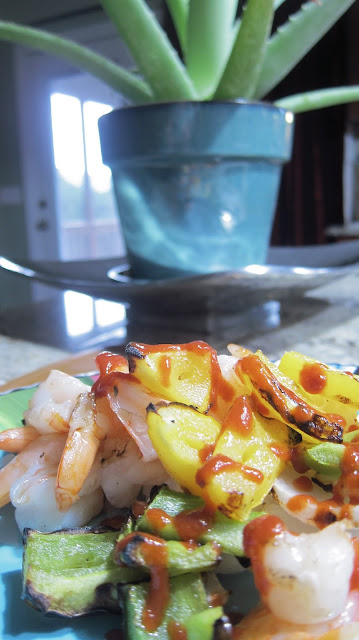AND.... instead we boiled some rice and topped it with the grilled veggies and shrimp with a bit of hot sauce.